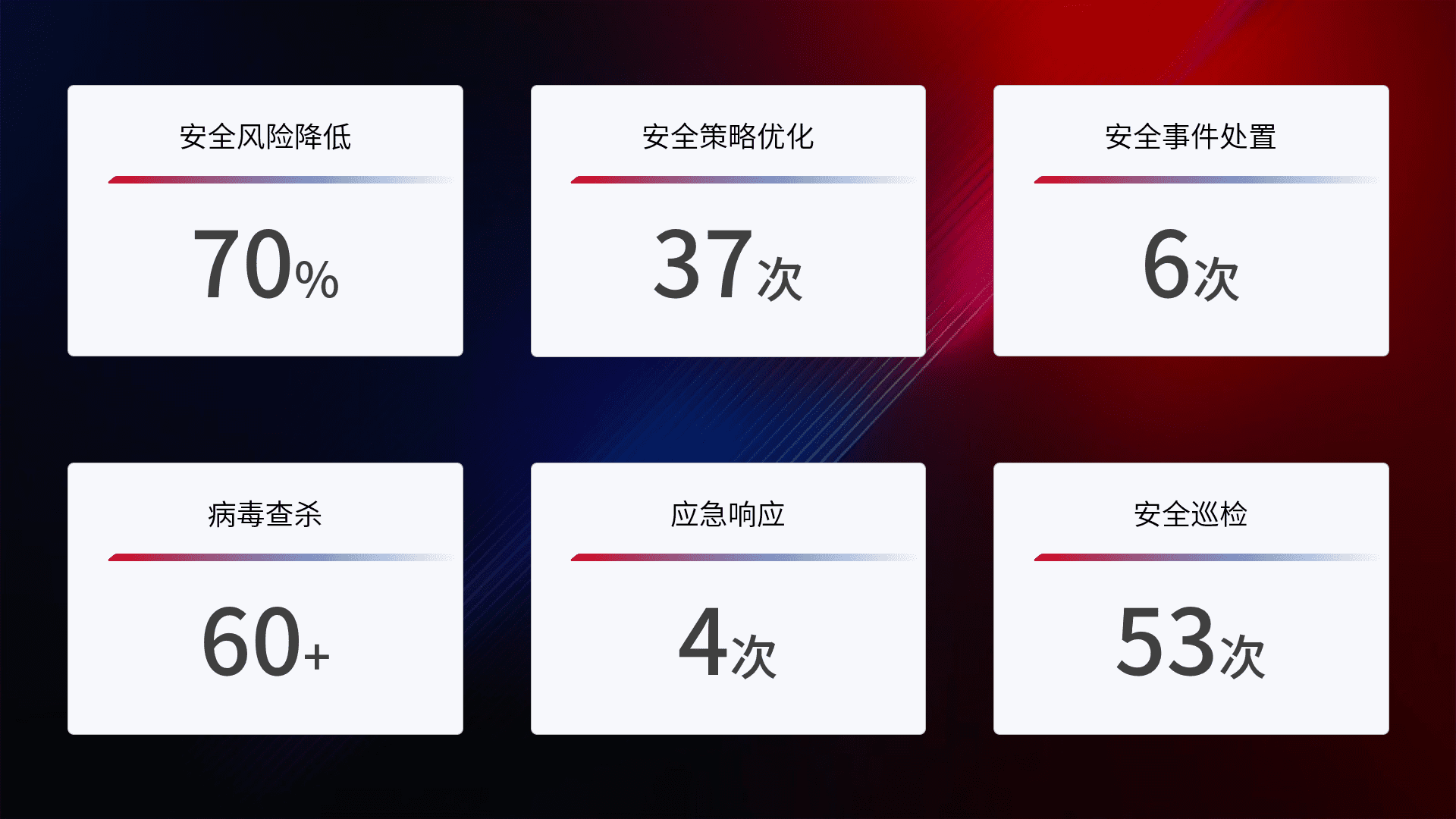 提供全面的安全事件报告体系,,,,包括处置报告、、、周报、、、、季度和年度总结,,,结合持续监控,,,,帮助客户深入了解网络安全状况。。。
