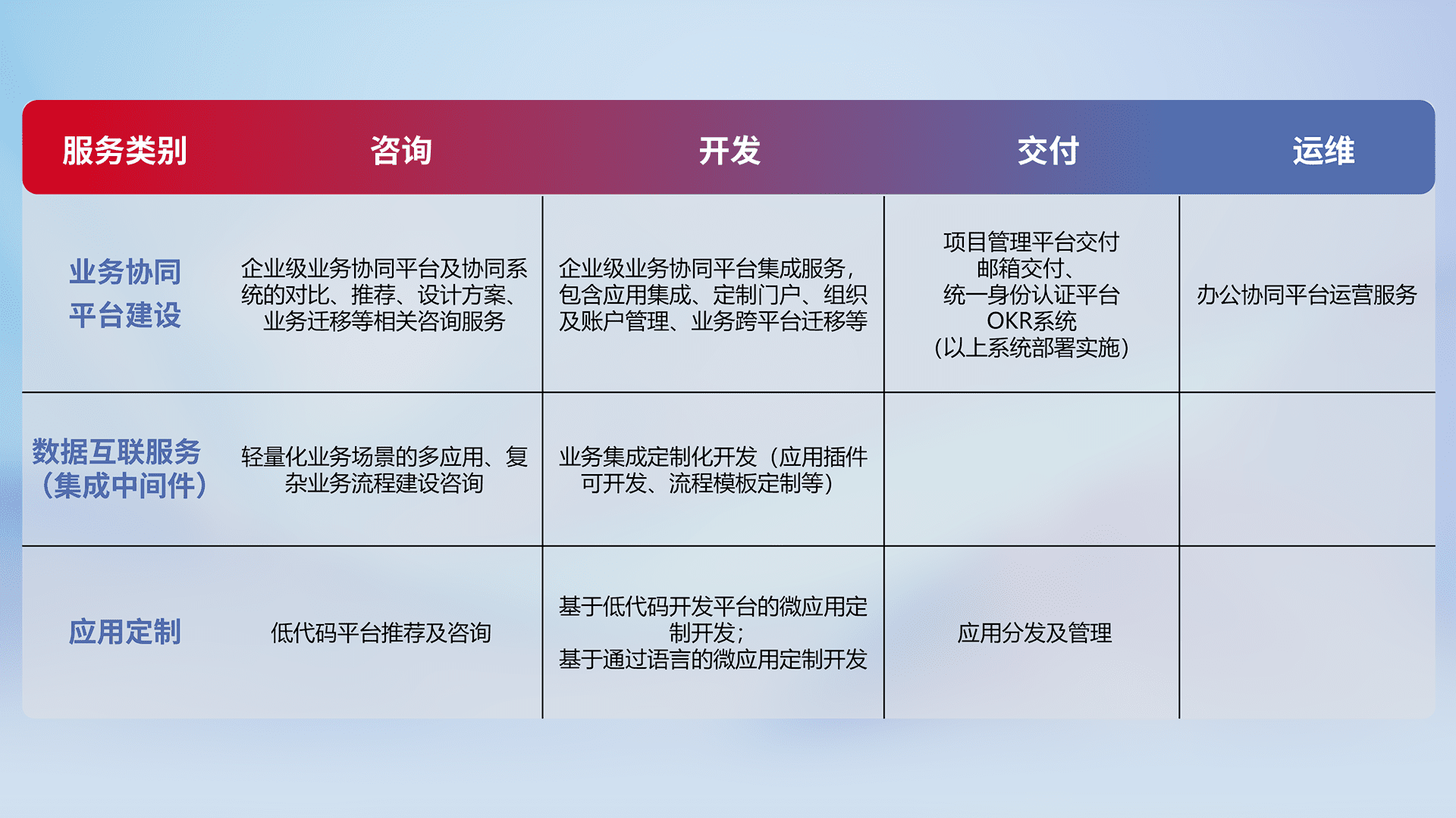 针对钉钉、、、企微、、、、IDaas等平台级产品提供产品的规划、、方案、、、、交付、、定制化开发等服务,,实现如统一协同办公、、、、智能客户服务、、、、混合会议管理、、、智能数据查询、、等业务场景,,实现数字化转型。。。
