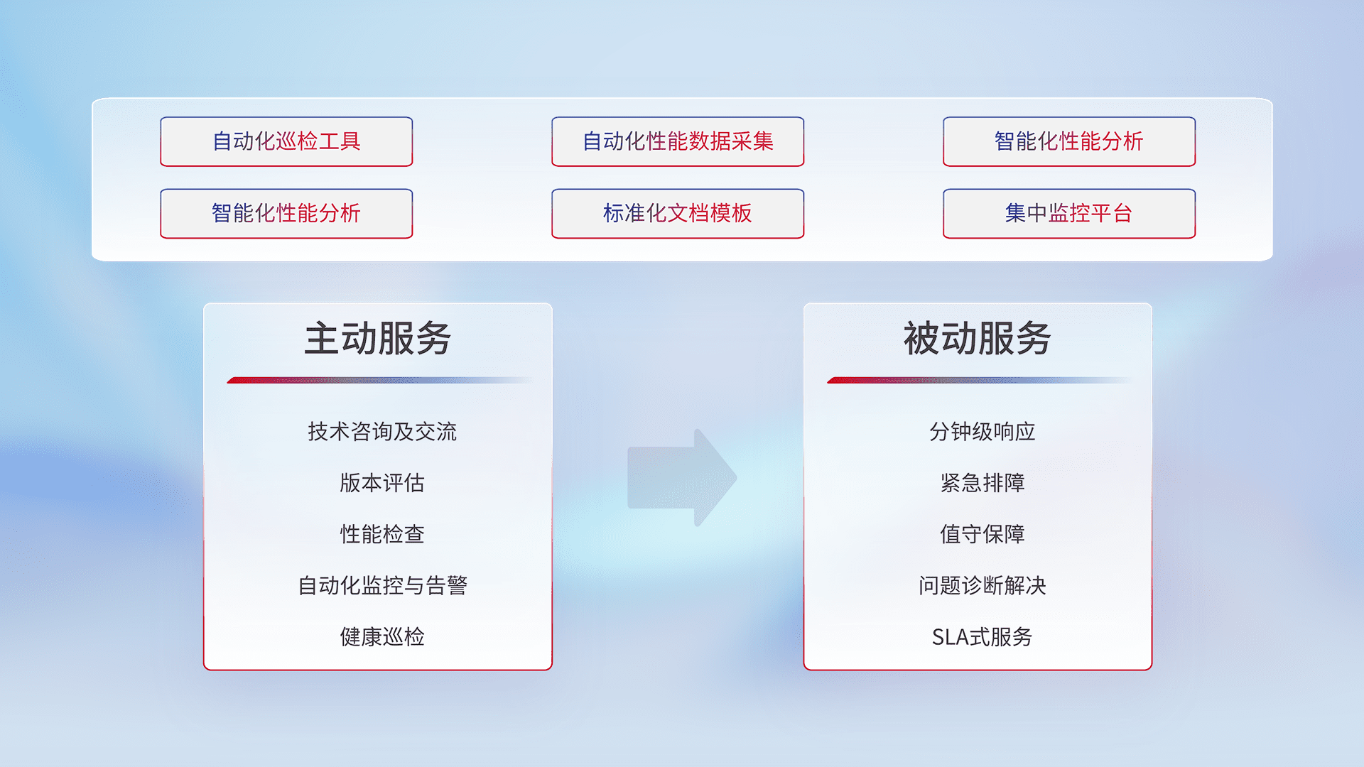 智能化工具和标准化文档,,,,保障服务质量,,,,提供主动服务(包含技术咨询、、版本评估、、、性能检查、、、、自动化监控与告警、、、、健康巡检)和被动服务包含(分钟级响应、、、紧急排障、、、值守保障、、、、问题诊断解决、、SLA服务)。。。