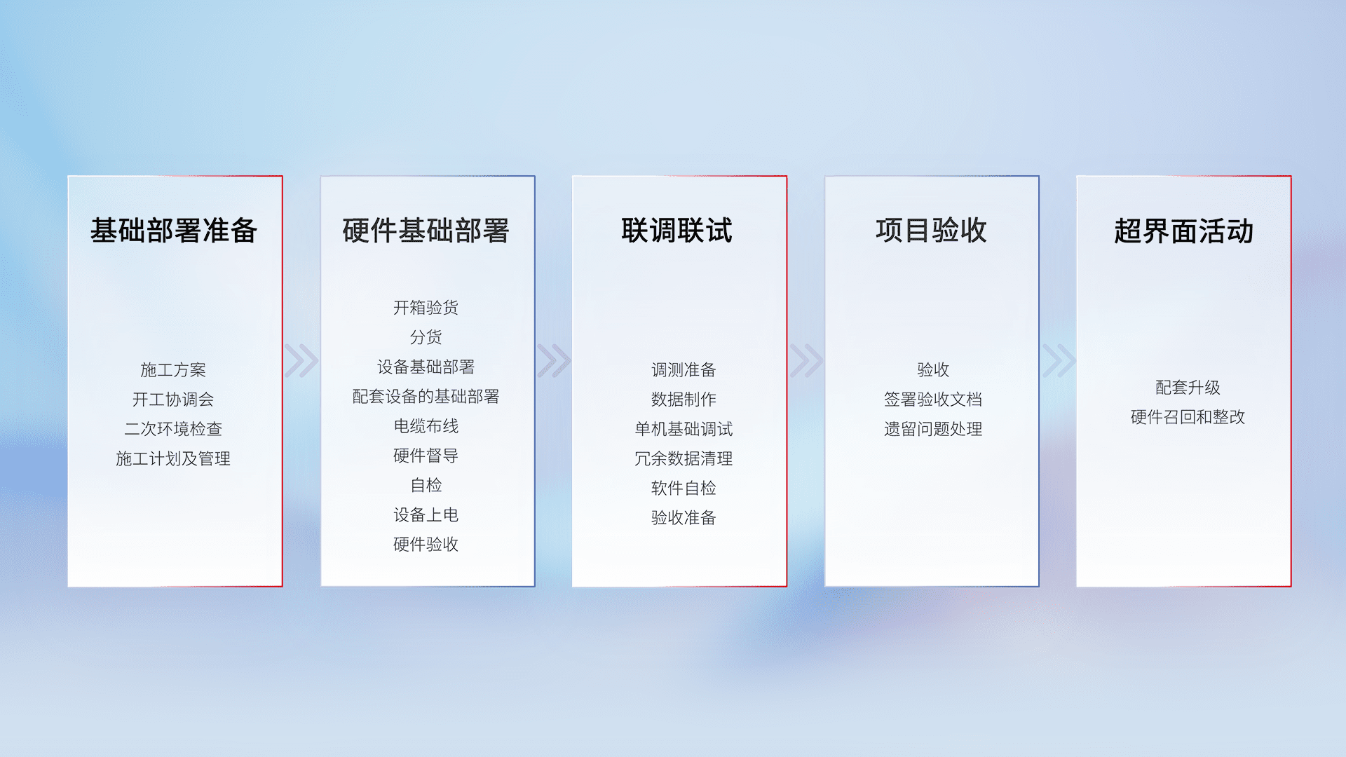 从基础部署准备、、硬件基础部署、、、、联调联试、、、、项目验收、、、越界面活动的全过程可追溯,,,,保证施工质量和进度。。。